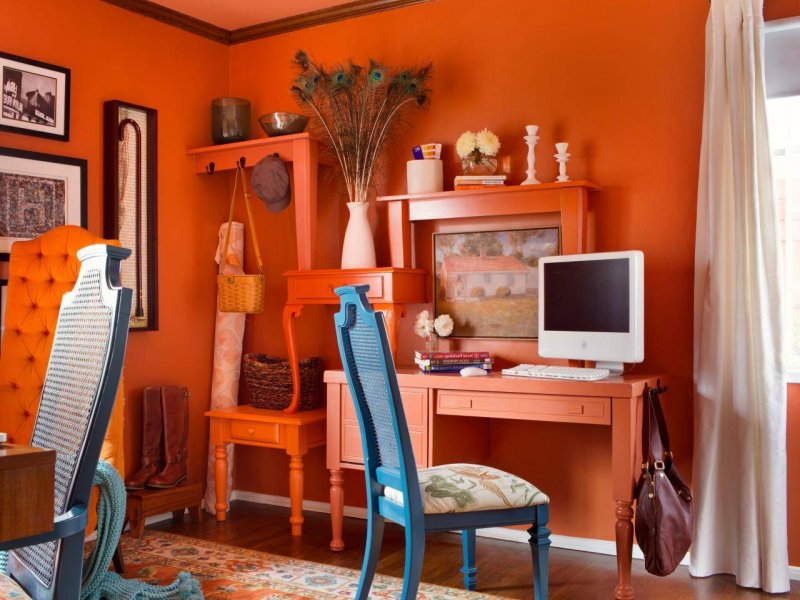 Сочный оранжевый, как и желтый, благоприятно будет воздействовать на настроение. Он излучает энергию и способствует мышлению при разработке креативных идей. Но согласно мнению психологов, лучше не делать его доминирующим, а использовать в дуэте с более спокойным тоном или в виде вкраплений.
