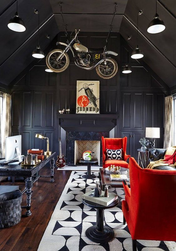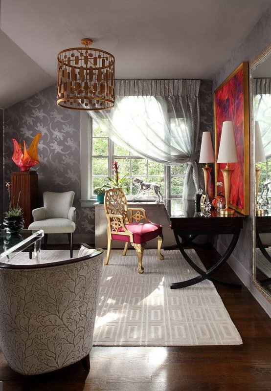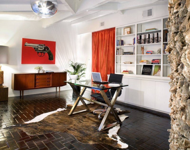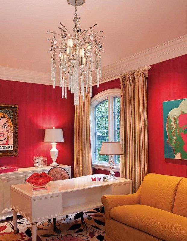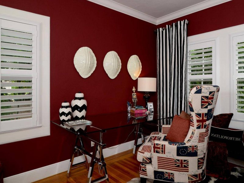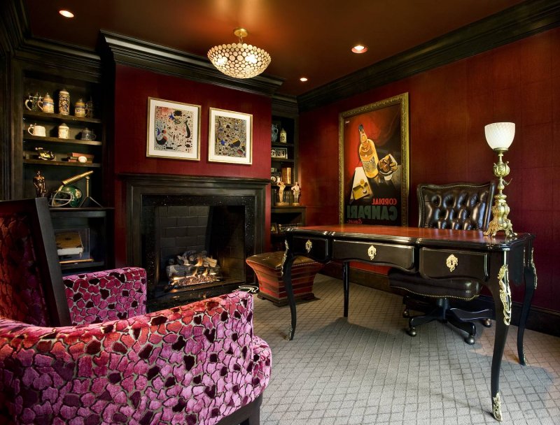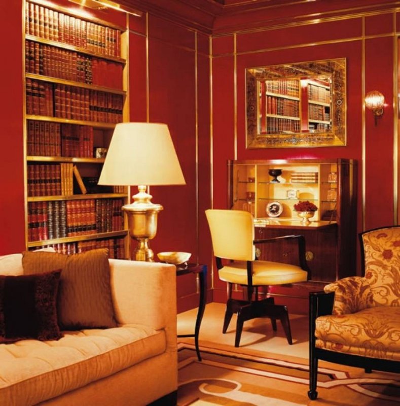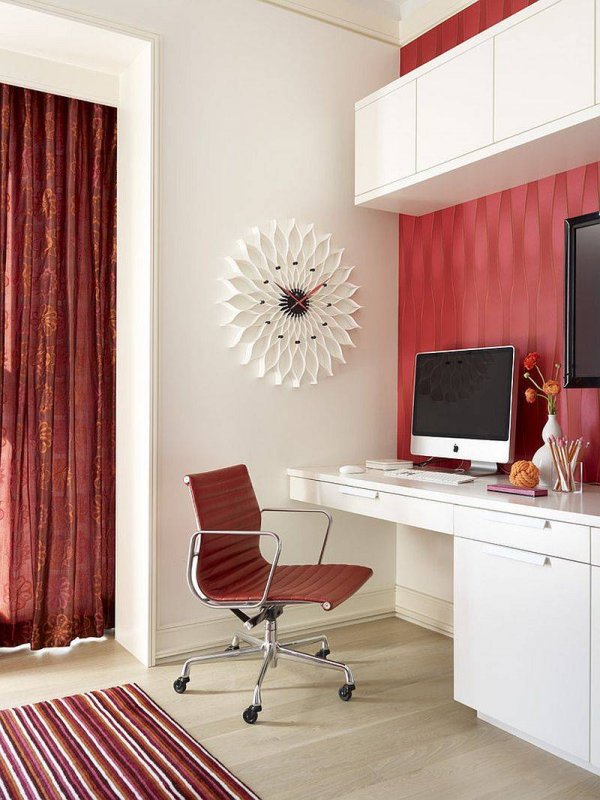 Ненасыщенного красного цвета в кабинете могут быть обои, но с ненавязчивым светлым узором. Красным можно выделить желаемые акценты или детали мебели.