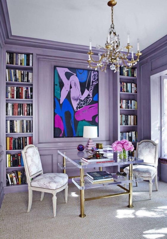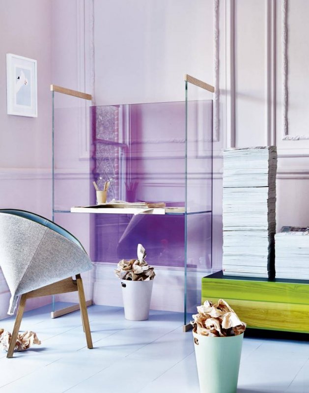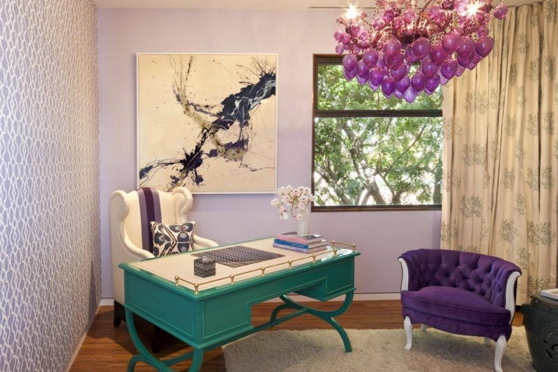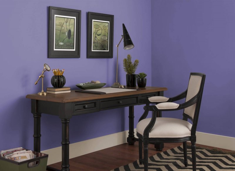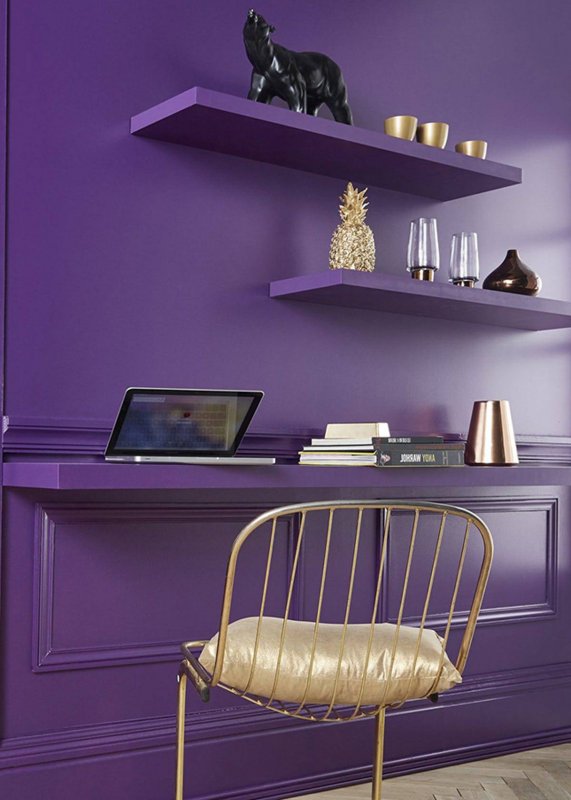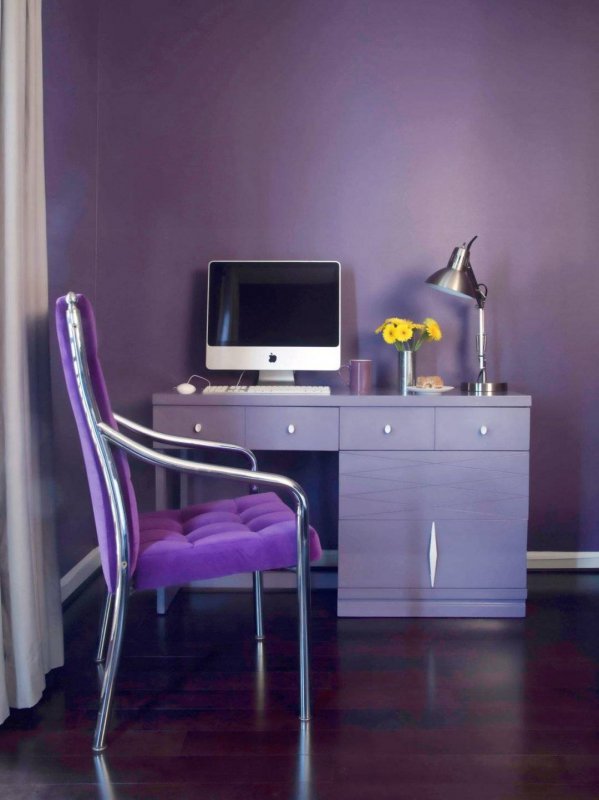 Ввиду своей насыщенности и яркости фиолетовый чаще всего не доминирует в офисных помещениях. Такой расцветки может быть одна из стен или некоторые предметы мебели. Гармонирует фиолетовый в стенах офиса с белым, серым, венге и зеленым.