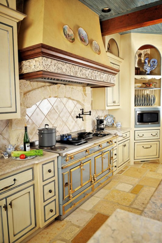 Золотистая отделка кухонного гарнитура смотрится тепло и нарядно: металл и дерево в интерьерах – прекрасные союзники. Полированные хромированные краны интересно сочетаются с хрустальными люстрами. Медные горшки и сковородки – аксессуары для спокойного деревенского интерьера загородного дома.