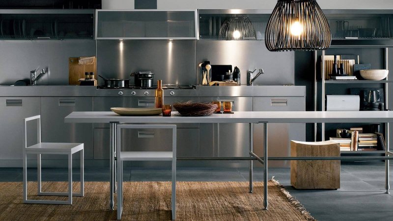 На кухне стальное сияние украшает фасады и оборудование. Здесь допустимо использовать изделия из латуни, железа, меди, хрома, алюминия. Оптимальный же вариант отделки этого помещения – нержавеющая сталь: она устойчива к коррозии, проста в уходе.