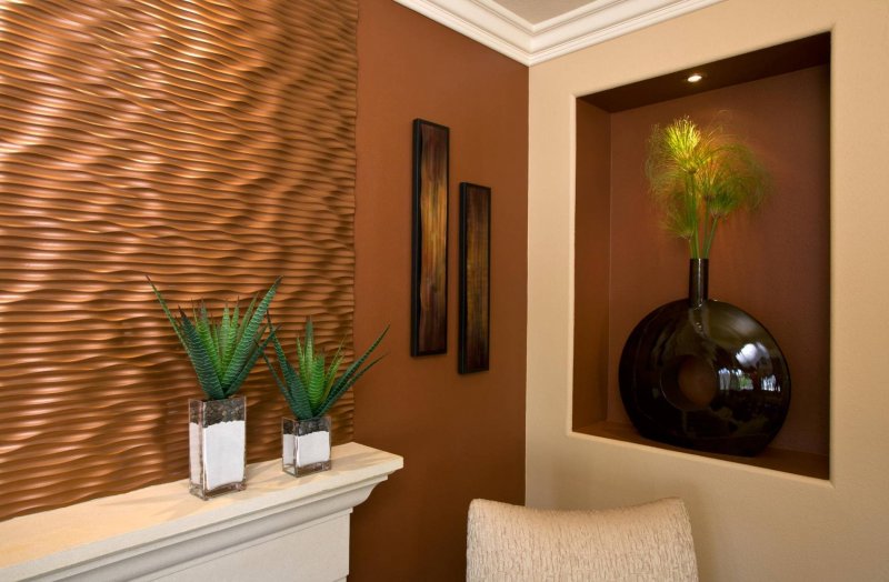 За счет имитации патины, ржавчины, эффекта оплавления такая облицовка получит эксклюзивный характер. Обработанные детали интерьера из бронзы или меди органично дополнят исторические стили, из хрома и железа – квартиру в стилистике лофт и хай-тек.