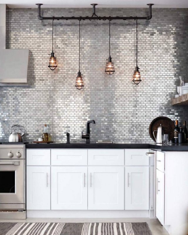 Если поверхность будет полированная или хромированная, то отражающий глянцевый эффект расширит пространство и придаст дополнительное ощущение чистоты. Металл может присутствовать в кухонной утвари, настенной мозаике, фартуке, листах для отделки, фурнитуре, технике.
