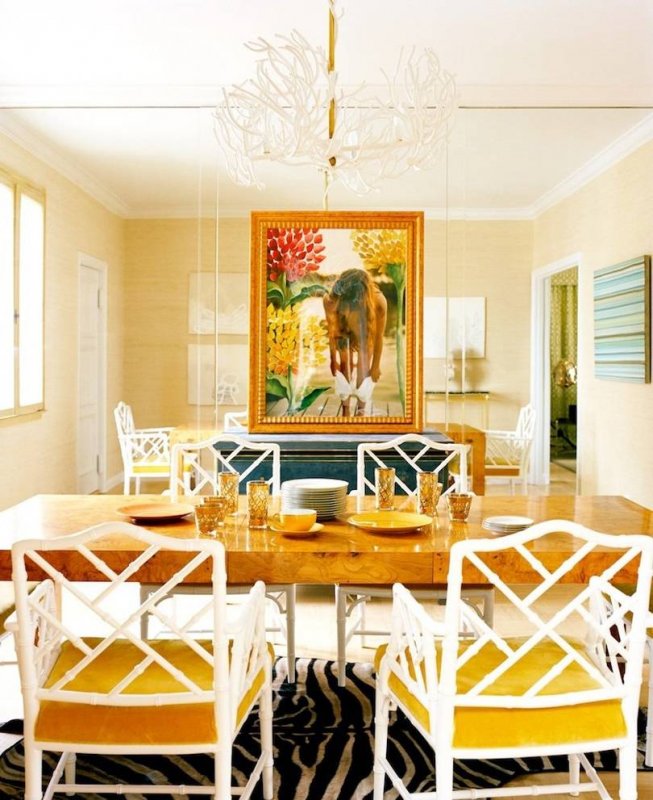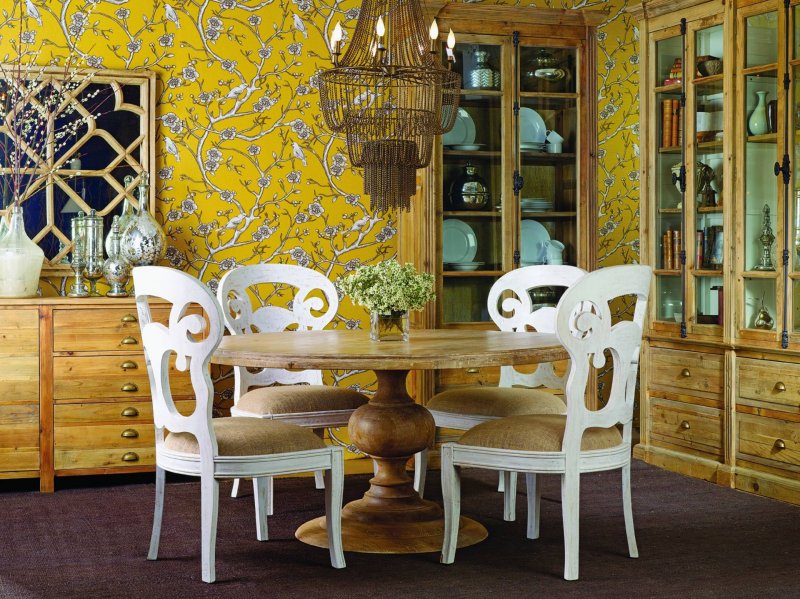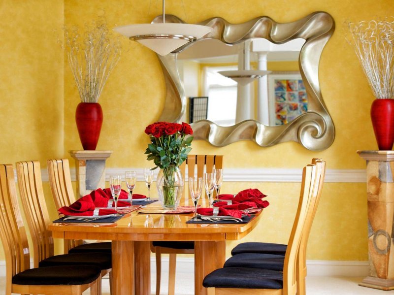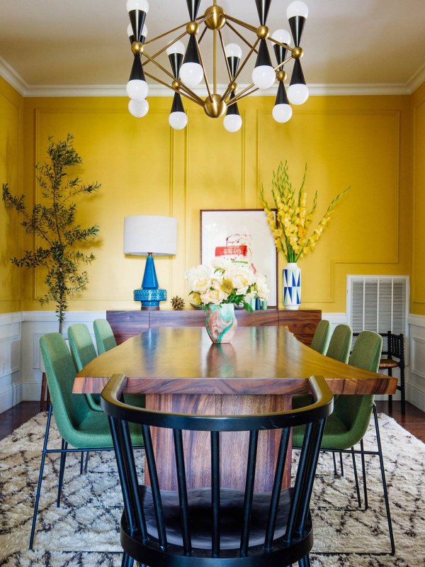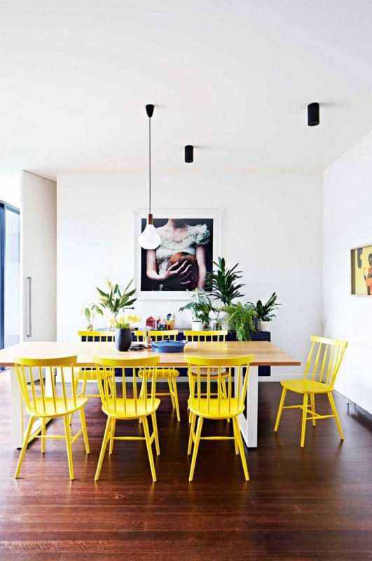 Солнечный желтый цвет сделает столовую яркой и сочной. Он круглый год будет дарить ощущение летнего тепла, ассоциироваться с урожаем и улучшать настроение. Желтый удачно комбинируется с оранжевым, синим, белым, фиолетовым и серым цветом. Чаще всего он не доминирует, а используется в сочетании с другими расцветками.
