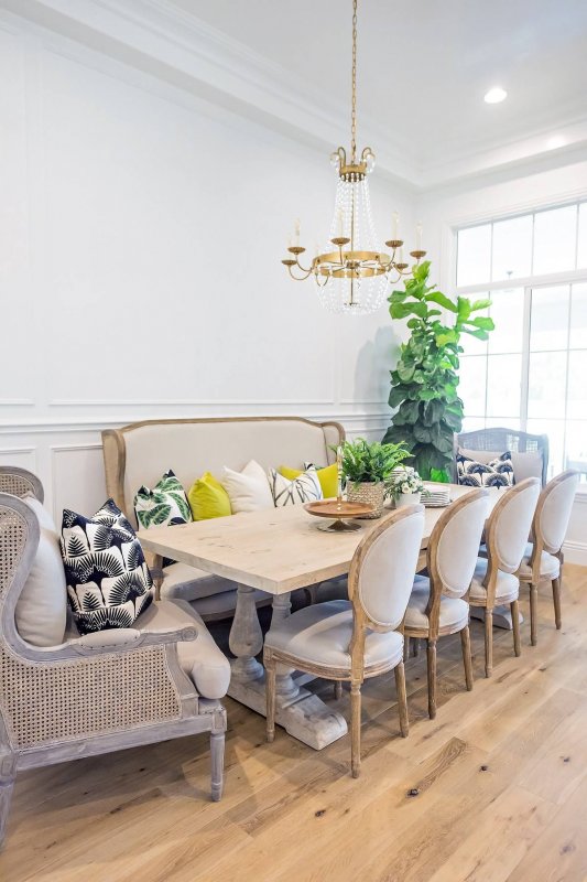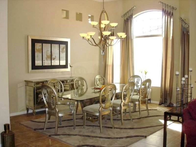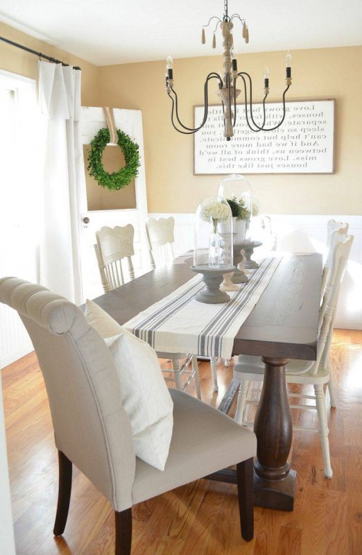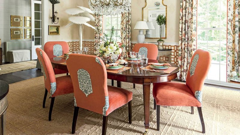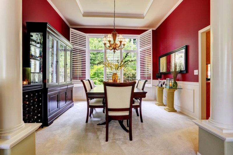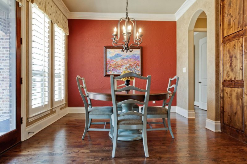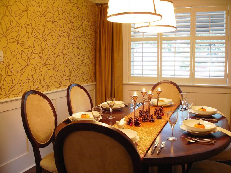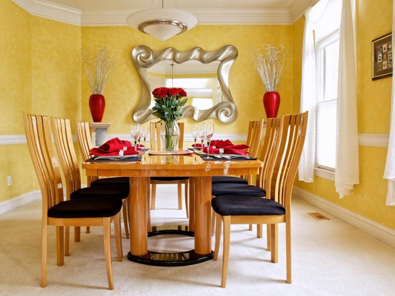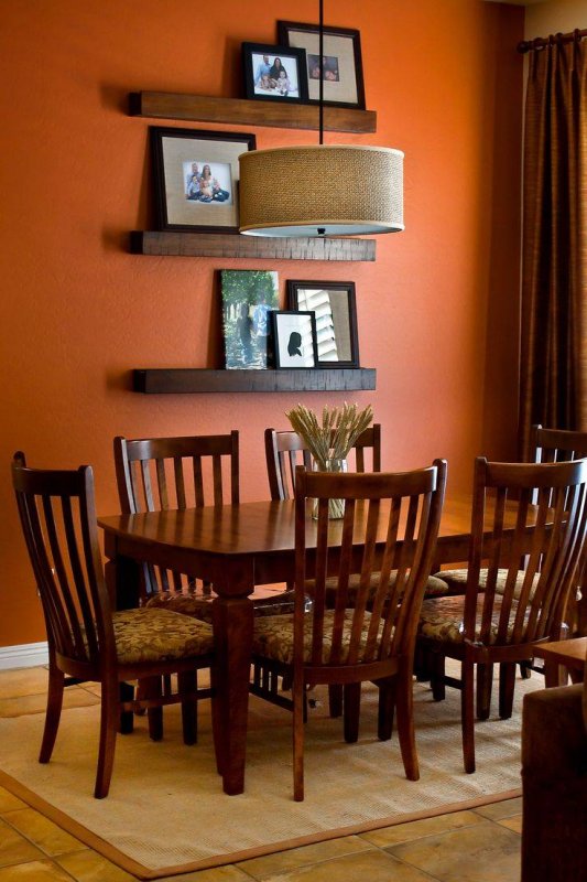 Цвет столовой можно выбрать 1, но используя его разные оттенки. Тогда обстановка не сольется в одно целое и можно будет выделить желаемые акценты.