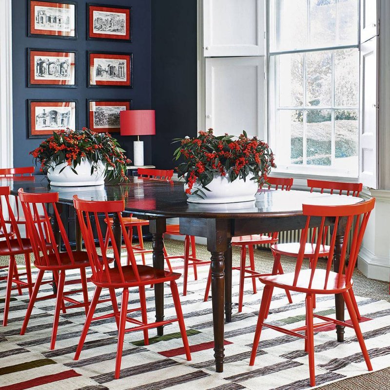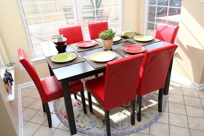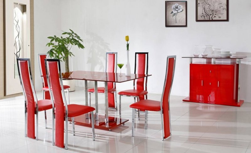 Цвет яркий, динамичный и подходит по темпераменту далеко не всем. Столовая в красном цвете будет выглядеть выразительно и современно, особенно если красный будет выражен на глянцевых поверхностях.