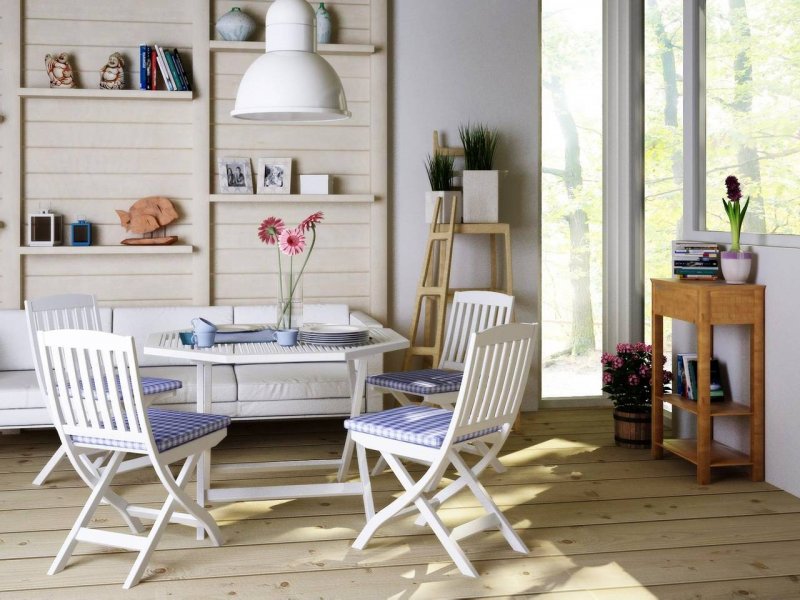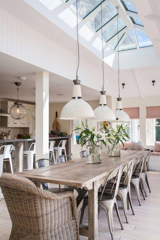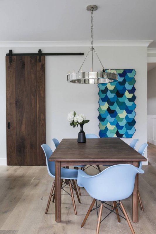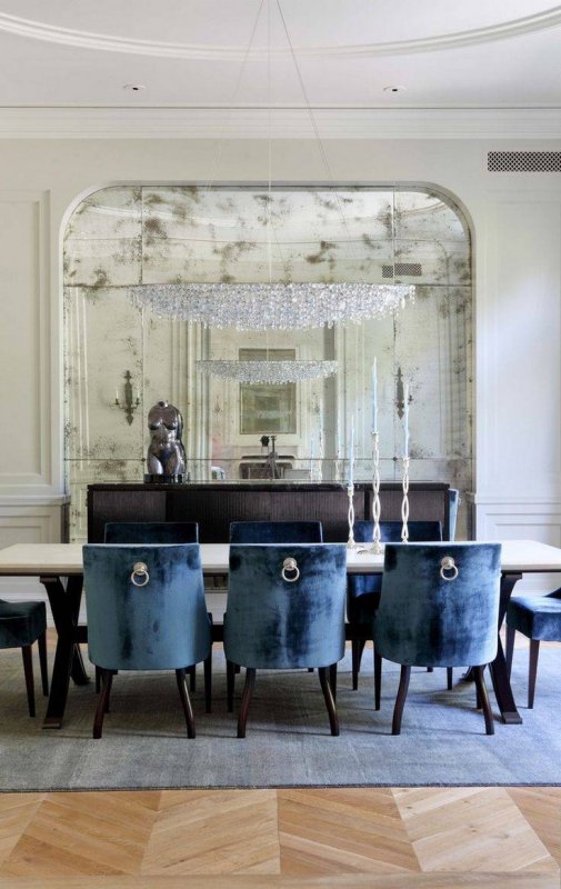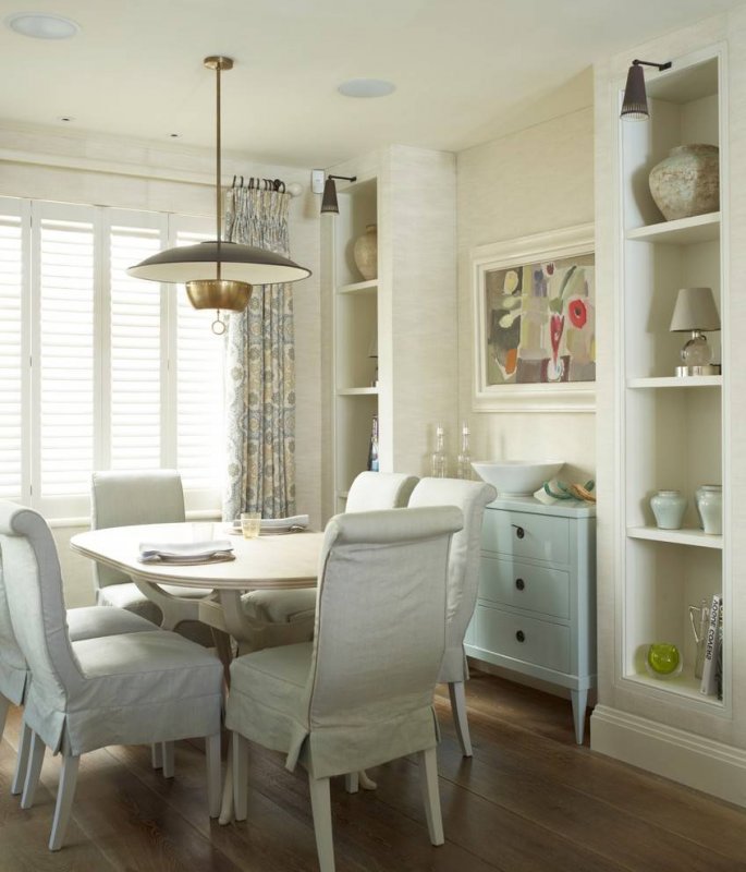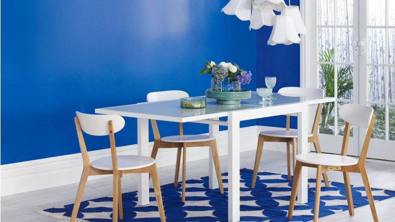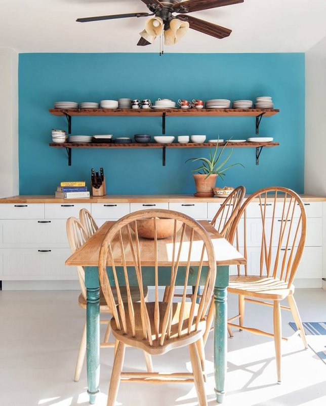 Столовая в голубом цвете у многих ассоциируется с морской свежестью и энергией водной стихии. Средиземноморские нотки ей придадут такие цвета: оливковый, салатовый, бирюзовый, лазурный, синий, белый, а также бежевый.