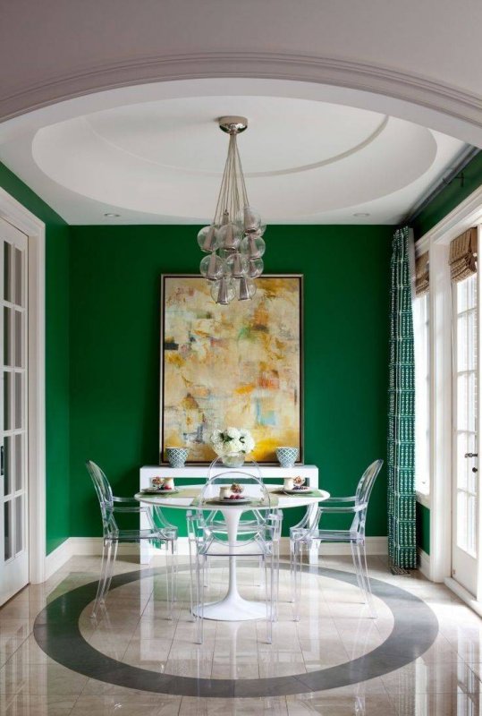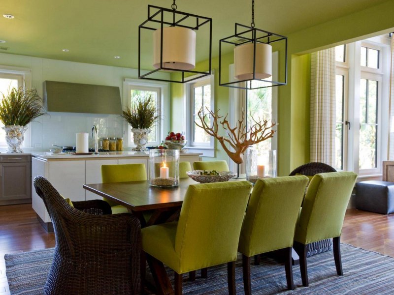 Зеленый цвет в столовой считается одним из самых выигрышных и популярных. Он олицетворяет природу и спокойствие. В такой столовой всегда приятно будет проводить время. Зеленый удачно сочетается с фиолетовым, белым, коричневым, золотистым.