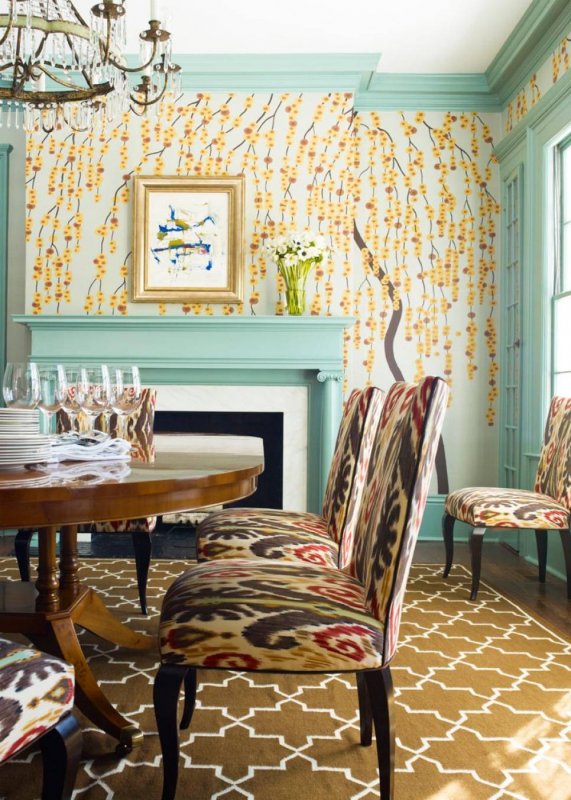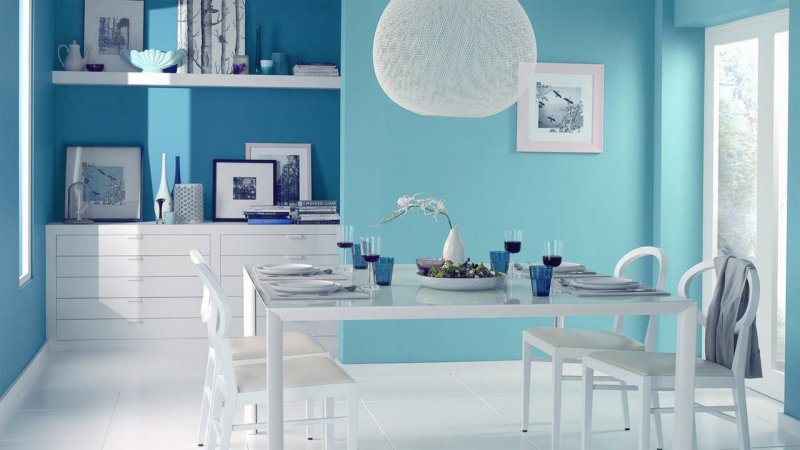 Это ненавязчивый цвет в интерьере столовой. Он подойдет для помещений с морской или средиземноморской тематикой (как синий и голубой цвет). Напоминая лазурную гладь моря, он успокаивает и улучшает настроение. Гармонирует тон в интерьере с синим, голубым, белым, оливковым.