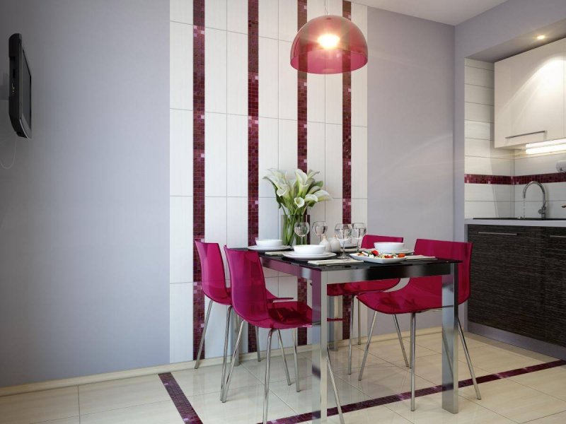 Доминирующий фиолетовый насыщенный цвет может психологически перегружать, а в маленьких столовых он будет скрадывать пространство. Он удачно комбинируется с серым, желтым, золотистым, зеленым, черным и белым цветом.