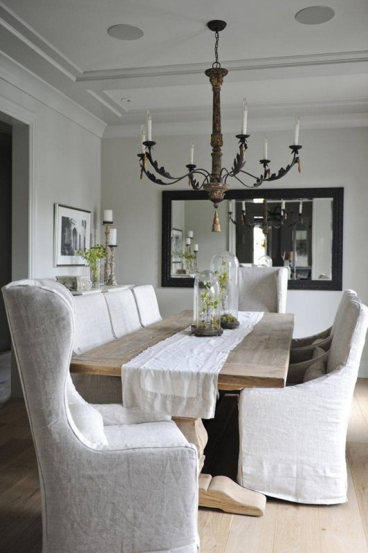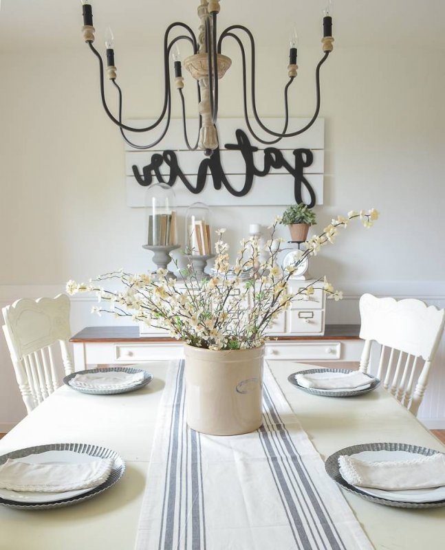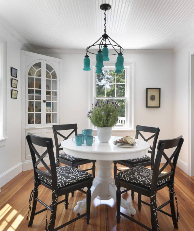 Столовая в белом цвете будет выглядеть изящной и воздушной. Белый хорошо сочетается со всеми тонам и задает контраст. Наиболее популярные комбинации с черным, красным и синим тоном. В качестве цвета потолков в столовой чаще всего выбирают именно белый.