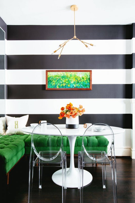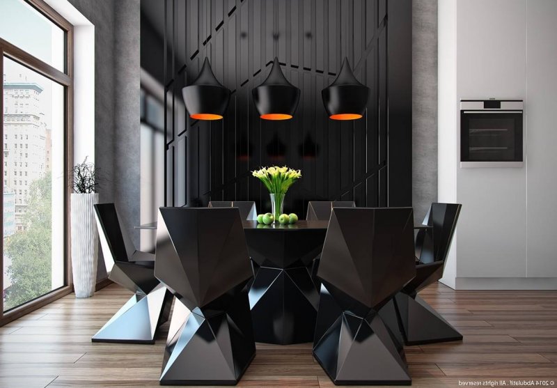 Несмотря на то, что черный также сочетается со всеми расцветками, не делаете его в столовой доминирующим тоном. Некоторых людей он будет психологически перегружать, а в столовой хочется принимать пищу в комфортной обстановке. Допустимы в столовой дуэты черного с красным, белым, розовым, зеленым.