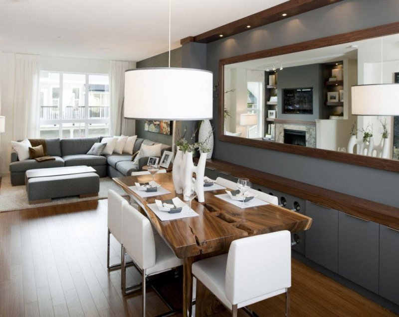 Чтобы столовая серого цвета не казалось скучной, не делайте классический серый тон главным. Такое решение на любителя. Серый впишется в практически любую обстановку. Эффектно дополнит дизайн столовой в сером цвете розовый, голубой и фиолетовый. Довольно интересное дизайнерское решение – серая столовая (на манер черно-белой фотографии) и один или несколько ярких предметов, например, розового цвета.