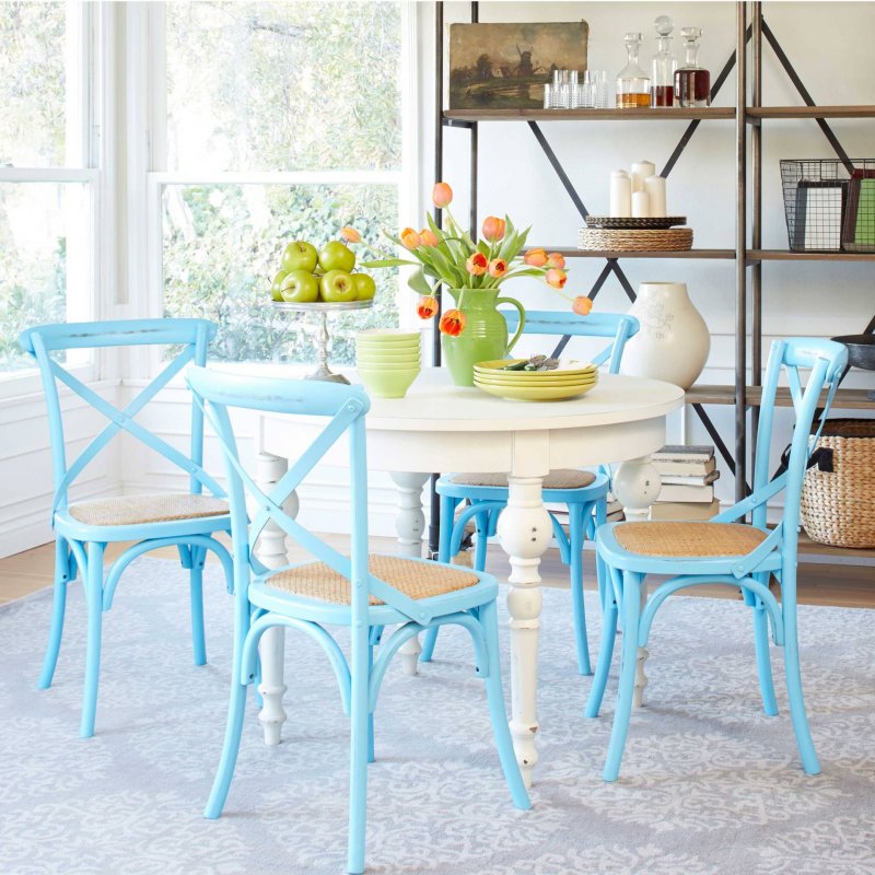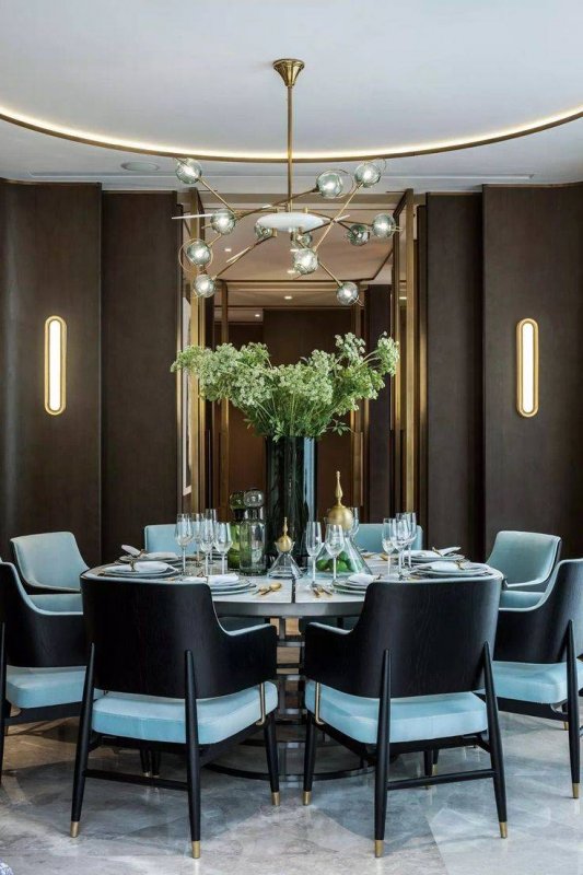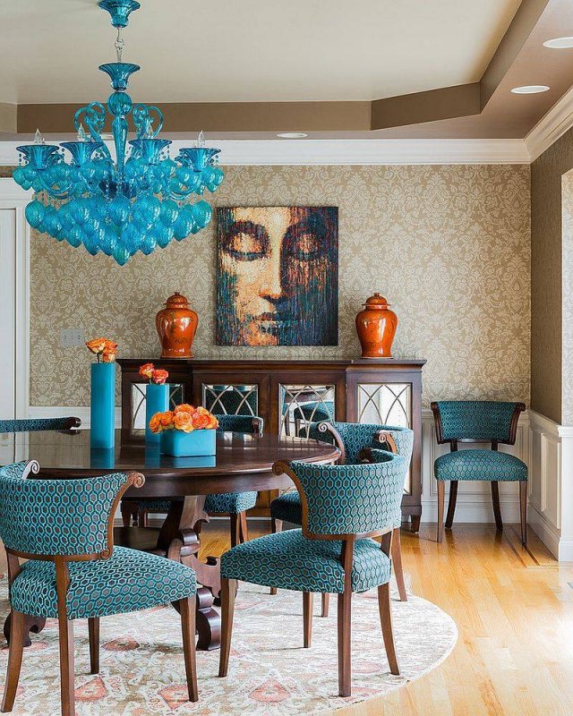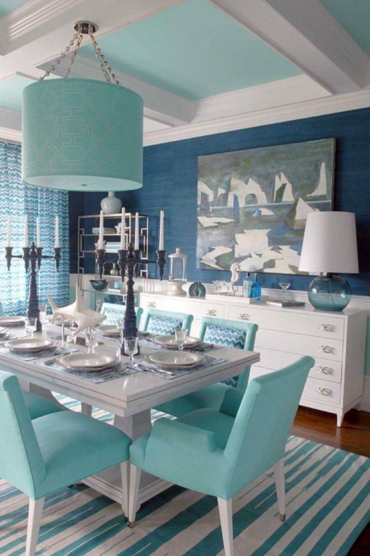 Этот цвет придает помещению свежесть. Тон приятный для глаз и легкий для восприятия. Дизайнеры рекомендуют с помощью бирюзового цвета выделять в столовой желаемые акценты (например, шторы, мягкий уголок, стулья, одну из стен).