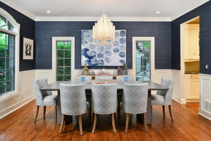 Благородный и глубокий синий цвет выгодно преобразит любую столовую, сделав ее выразительной. Столовая в синем цвете дополняет морскую тематику в интерьере. Синий желательно делать доминирующим в больших по площади столовых, чтобы он не скрадывал пространство. Основные сочетания – с желтым, коричневым, зеленым и белым.