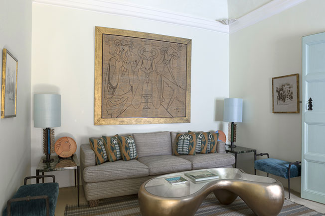 Гостиная. Диван, пуфы и стулья спроектировал Фрэнсис Султана. Настольная лампа Garouste & Bonetti. На стене работа Фрейваса Бэзова.