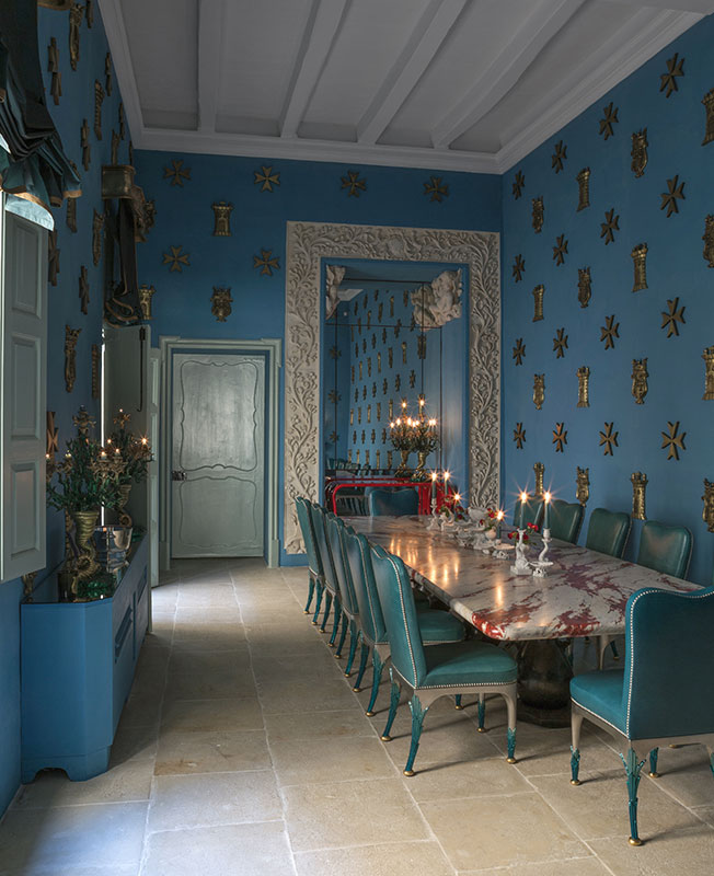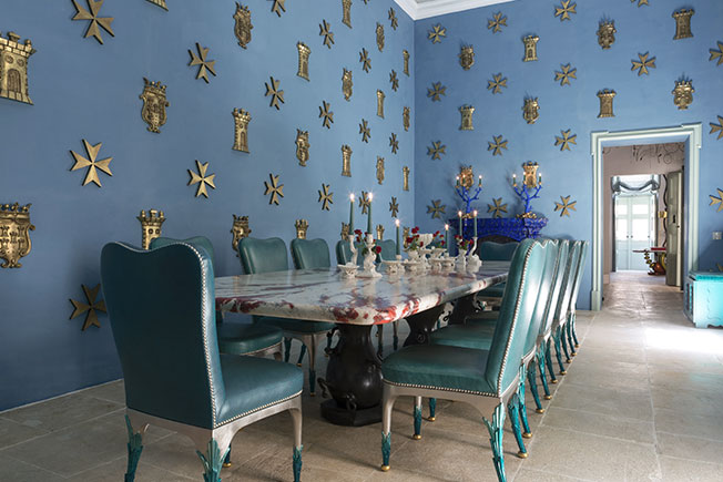 Стены столовой украшены позолоченными Мальтийскими крестами и башнями — дизайнер не мог обойти местный колорит. Стулья дизайна Маттиа Бонетти, стол Garouste & Bonetti.