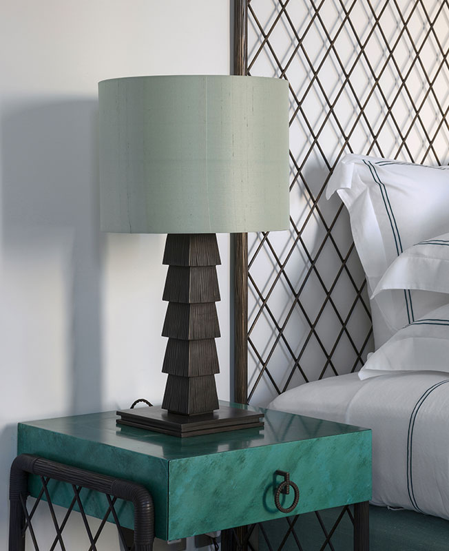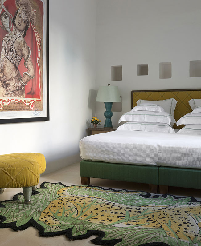 Одна из спален. Кровать дизайна Фрэнсиса Султаны, ковер Garouste & Bonetti, дизайн лампы: Николас Хэслем.