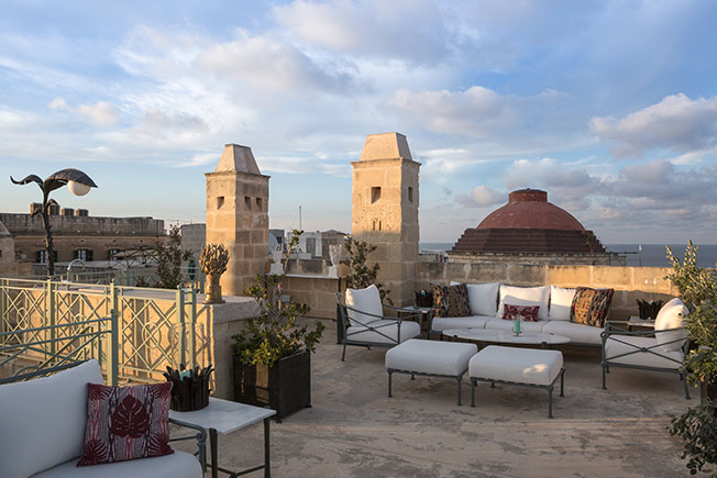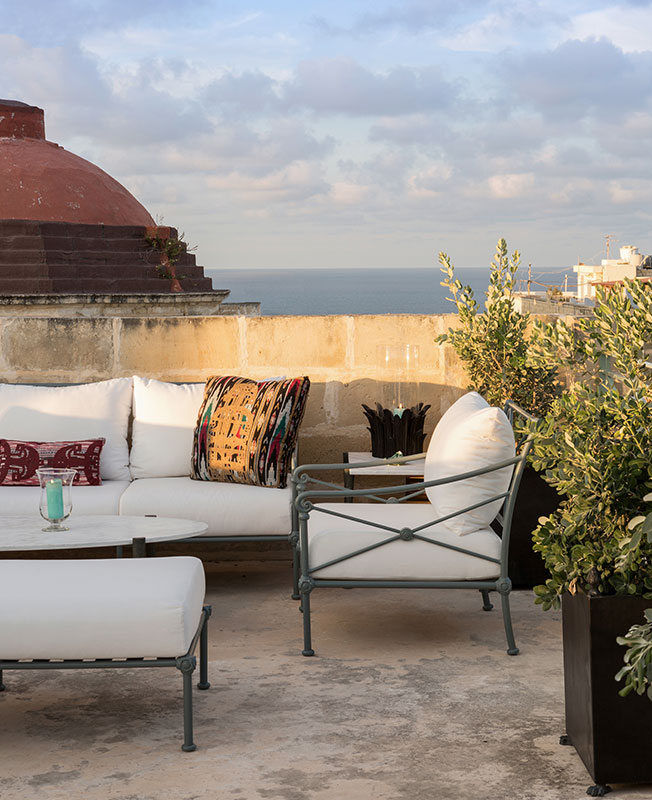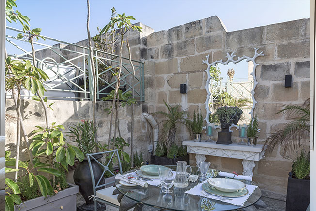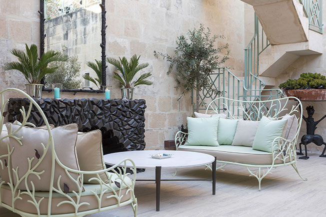 Я обожаю свою террасу на крыше, которую я проектировал скорее как серию комнат, в тени и на солнце — с мая по ноябрь большую часть дня я провожу на улице. Мне нравится наблюдать оттуда за Большим портом Валетты, смотреть на крыши города. Это очень успокаивает, когда после долгого путешествия по миру я возвращаюсь на Мальту и сижу на террасе с холодным коктейлем в руках. Мебель, которую я спроектировал для террасы, выполнена в металле с узором в виде веток и дополнена мягкими сиденьями. Я выбрал для предметов пастельный зеленый, который прекрасно работает в паре с кремовым камнем на стенах.