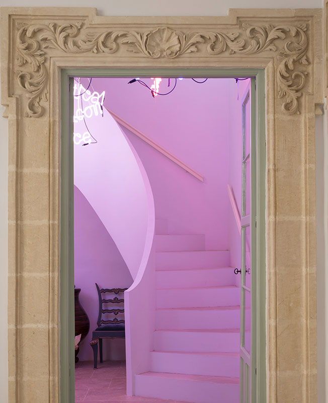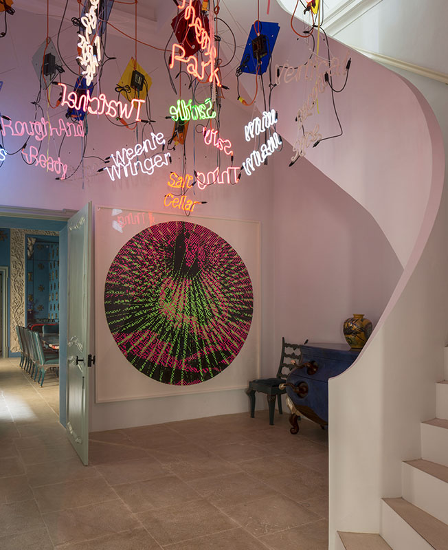 Лестница закручивается вокруг неоновой инсталляции Джейсона Роудса и ведет в приватные апартаменты. Современное искусство и барочный декор — модная коллаборация.