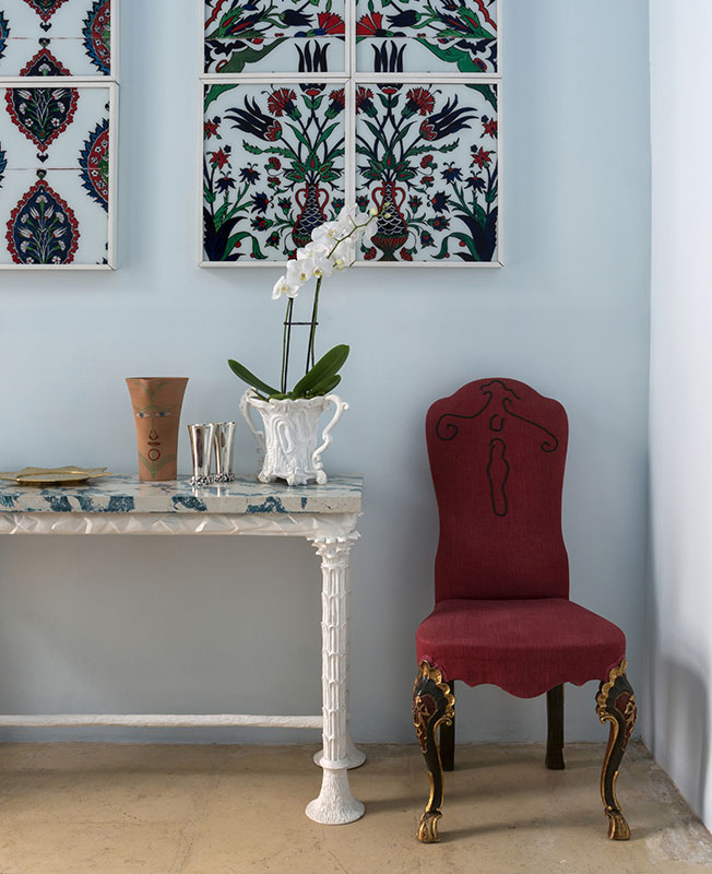 Стул 19 века «в редакции» Маттиа Бонетти. В консоли использована скальола — разновидности штукатурки, имитирующая мрамор. «Эти консоли олицетворяют стиль моего дома: микс антикварных, современных и заказных вещей».