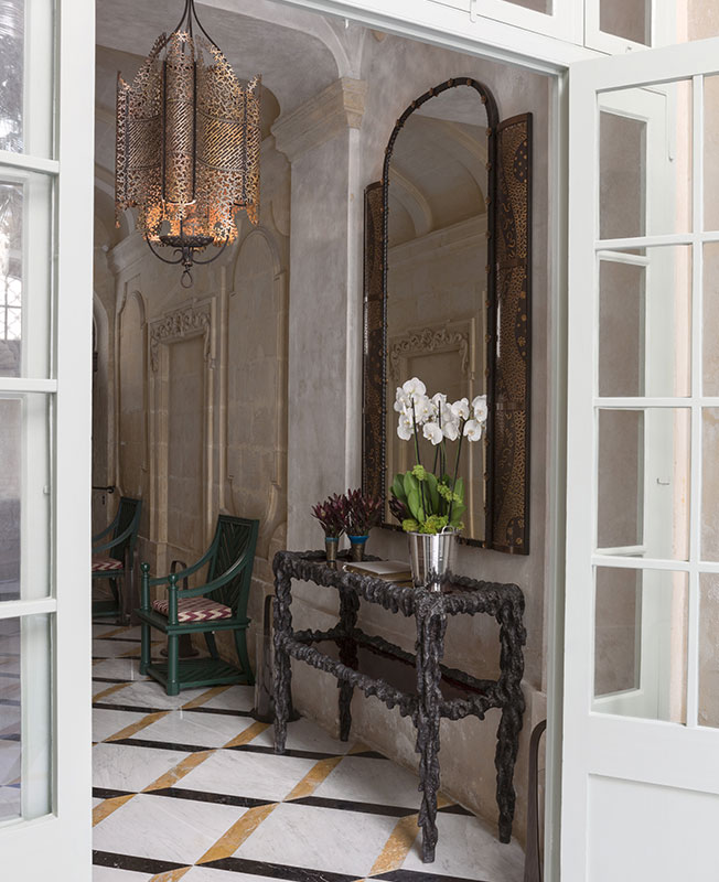 Коридор ведет во внутренний двор. Фонарь Андре Дюбрея. Стулья дизайна Эмилио Терри. Ткань подушек — купленный в Стамбуле икат. На полу новый мрамор — старый восстановить не удалось.