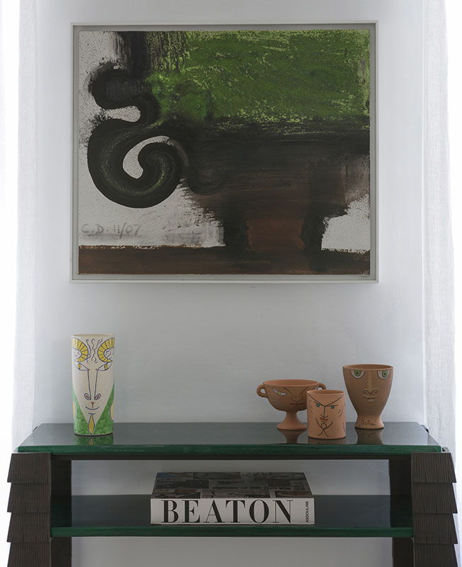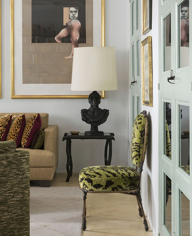 Для кабинета Султана спроектировал стеллаж из бронзы во всю стену. На полках керамика Эндрю Лорда и Жана Кокто. Стол дизайна Маттиа Бонетти, стулья в бархате Luigi Bevilacqua.