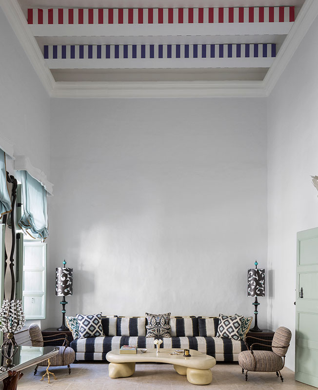 Аутентичные потолочные балки стали основой для инсталляции Даниэля Бюрена. Коктейльный столик, кресла, светильники, консоль — всё Маттиа Бонетти. Диван дизайна Фрэнсиса Султаны в ткани Dedar. Низкие сиденья усиливают восточный колорит.