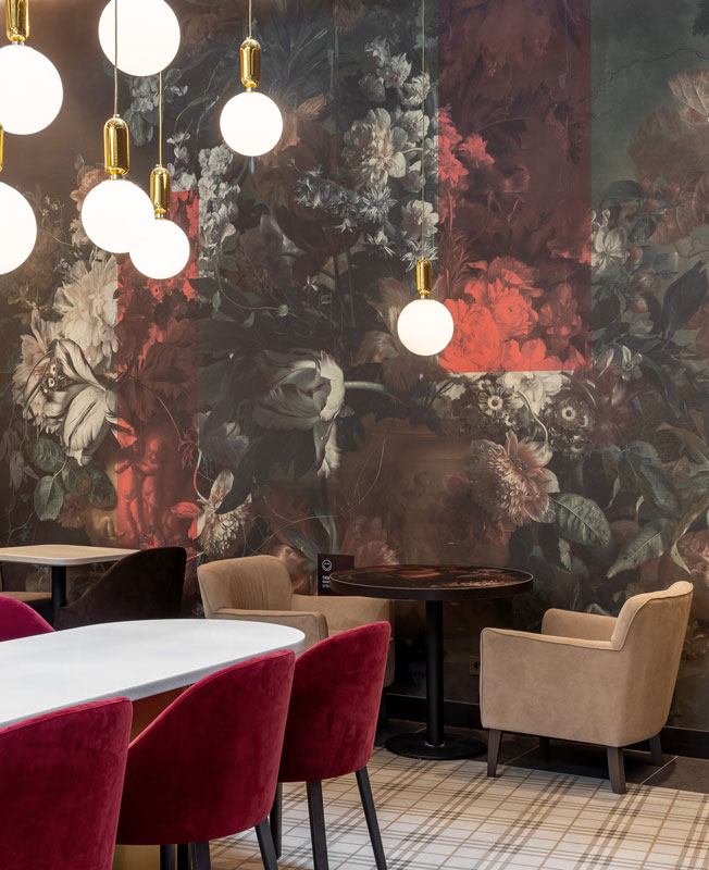 В обои с фламадскими цветами интегрировали геометрические композиции в духе конструктивизма. Таким образом был найден компромисс с минимальными изменениями , который понравился заказчику и устроил аэропорт».