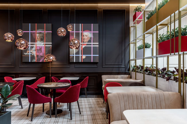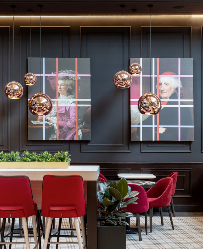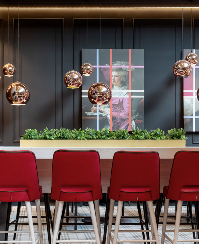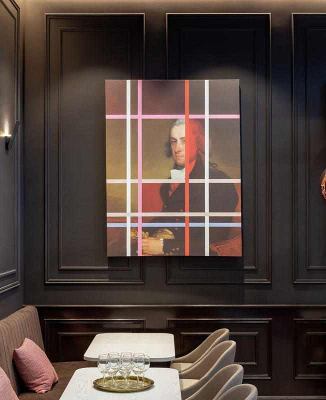 В результате центральный стеллаж, разделяющий зал на основной и камерный, превратился в композицию из объемов в стиле начала прошлого века. По такому же принципу были решены и барные полки. А на на стилизованные под классические старинные портреты мы наложили супрематическую разноцветную сетку.