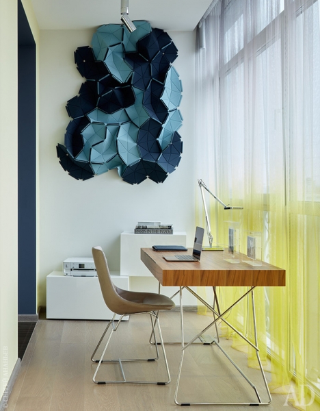 У этой московской квартиры площадь всего 50 м?, зато лоджия тут — обзавидуешься. Она отделена от зоны кухни прозрачной дверью-гармошкой. Здесь сделали полноценную комнату: есть рабочая зона и дополнительное спальное место (которое можно использовать и как диванчик для посиделок с друзьями).