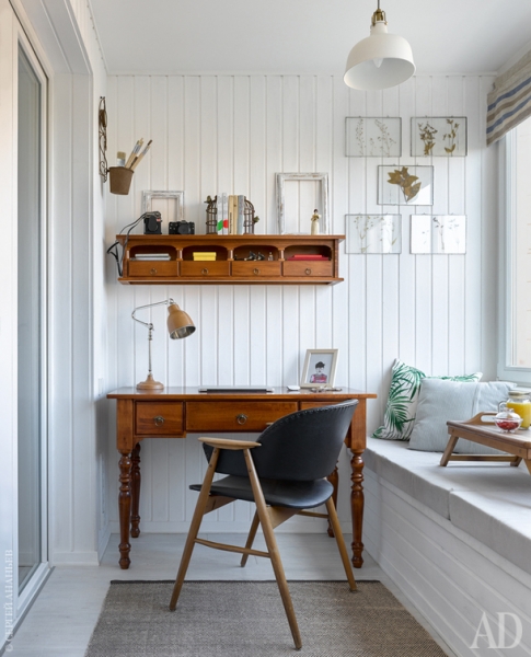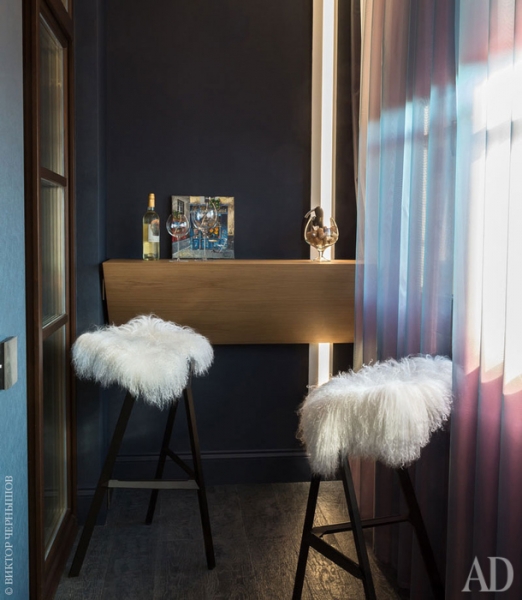 Рабочее пространство на балконе может выглядеть и вот так, как придумала дизайнер Наталья Кафтайлова. Секретер легко трансформируется в барную стойку, а темные стены и шторы делают и без того небольшое пространство еще более камерным.