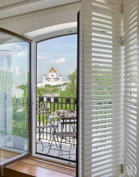 Незастекленный балкон — штука довольно богемная для России – пользоваться им можно ограниченное время. Но такой вид застеклять, конечно, жалко. Поэтому легкий столик и стулья — идеальная обстановка для такого балкона.