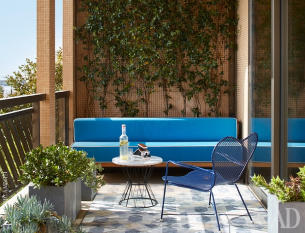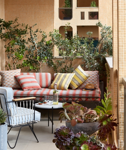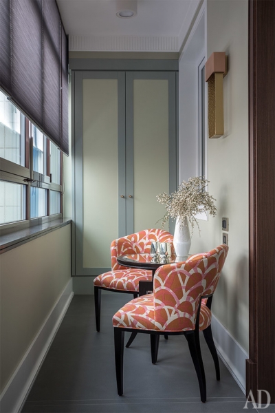 Часто бывает, что балкон небольшой по ширине, но при этом вытянутый. В таком случае логично использовать боковые стены для специально спроектированных систем хранения (готовые точно под ваш размер вы вряд ли найдете), а в пространстве посередине использовать минимум мебели, которую легко переместить в квартиру. Дизайнеры из Marion Studio сделали именно так на этом балконе в московской квартире. Шкафы по индивидуальному проекту. Журнальный столик от Bernhardt; стулья от Donghia (кстати, такие же, но в другой обивке стоят в столовой).