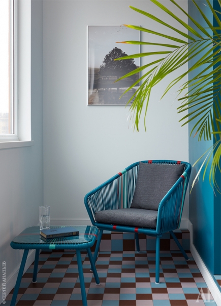 Еще один вариант оформления небольшого балкона в подмосковной квартире. Обстановка здесь минималистична, зато цвета очень смелые. Дизайнер сделала ставку на яркие оттенки мебели и броские геометричные узоры напольной плитки. Уравновесили такое буйство однотонные стены нейтрального цвета.