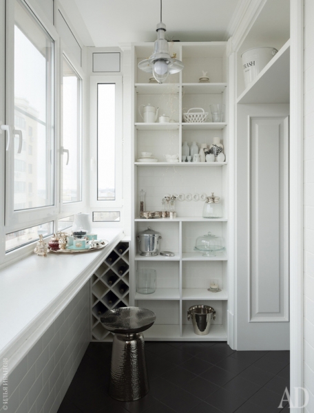 Этот балкон примыкает к кухне, поэтому логичным решением стала организация дополнительных полок для непоместившейся на кухне посуды. Вход на балкон оформлен деревянные панелями — теми же, из которых сделана кухня. А над порталом дизайнеры спроектировали еще одну просторную полку.