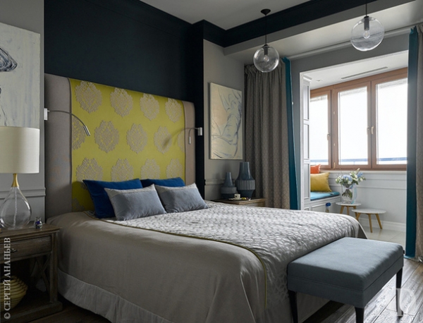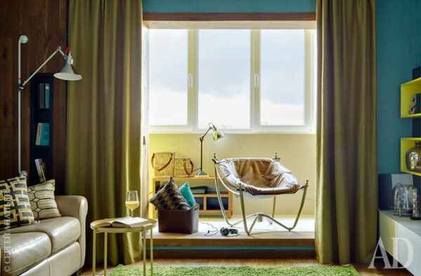 Лоджия в этой квартире примыкает к спальне. Вместо двери сделали проем, который может быть закрыт шторами. Для того чтобы "связать" пространства спальни и лоджии, последнюю оформили в схожей цветовой гамме и обустроили уютное место для чтения — в боковой стене сделали и книжные полки.