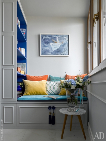 Если площадь балкона небольшая, то можно скомбинировать на нем шкаф и небольшой диванчик. Без мебели по индивидуальным эскизам тут не обойтись. Дизайнер Мария Файнберг, оформившая эту московскую квартиру, спроектировала всю мебель для интерьера, в том числе и этот шкаф-диван и столик из керамогранита для балкона.