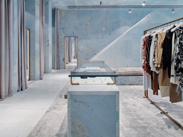 Основной материал отделки магазина — бразильский мрамор Pinta Verde небесно-голубого цвета с синими и зелеными прожилками. Толстые плиты служат полками для обуви и сумок, тогда как предметы одежды висят на минималистичных латунных рейлах.
