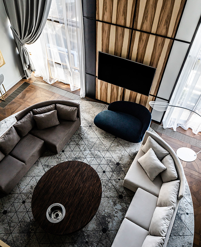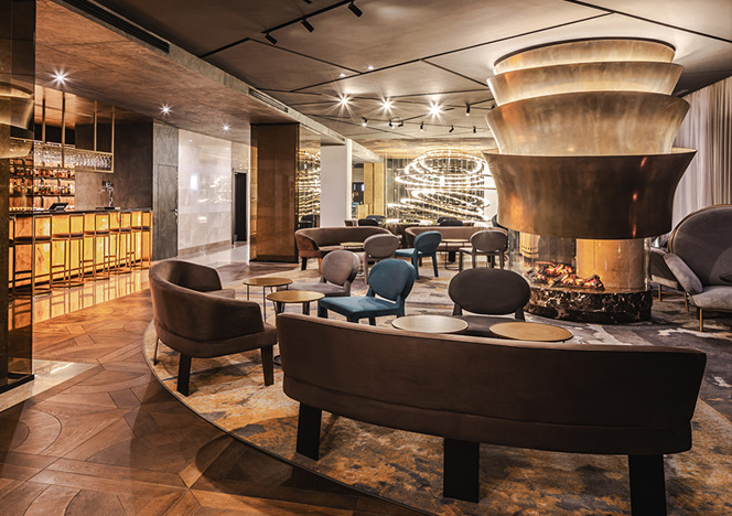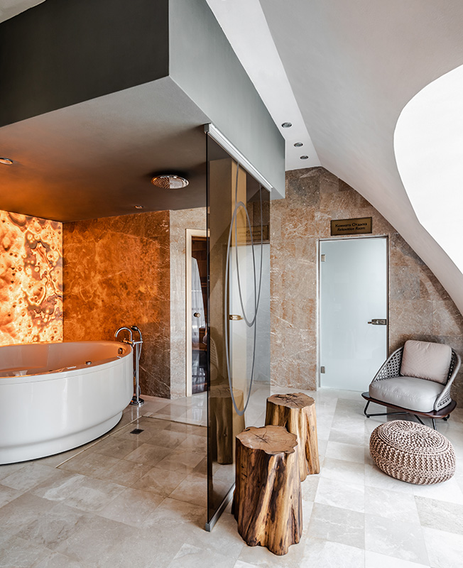 В центре лобби мы поставили паровой камин, он не только прост в эксплуатации, но еще и увлажняет воздух, и, конечно, дарит ощущение уюта и тепла. Также мы подчеркнули округлую планировку, добавив большой ковер полукруглой формы, диваны-лузы, огромные округлые кресла и закругленную барную стойку.