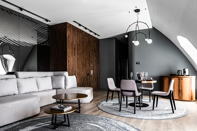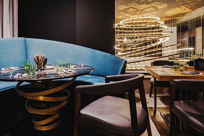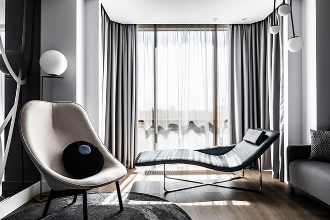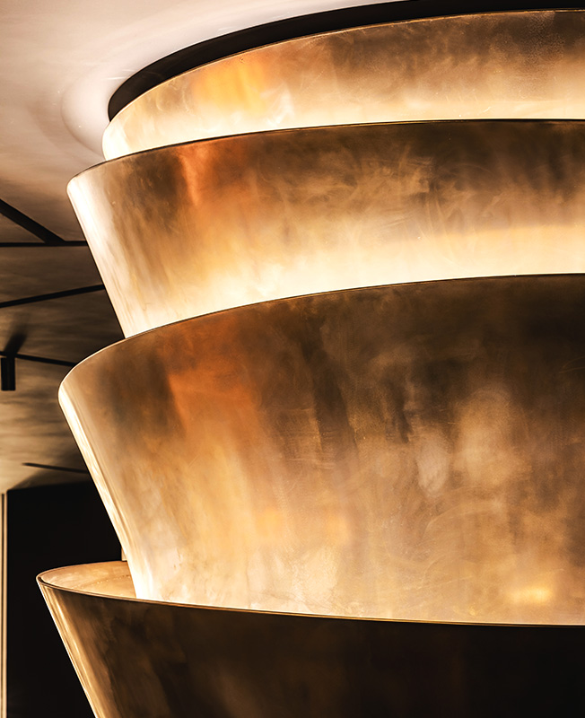 Отель расположен на центральной набережной Дона, через панорамные окна в лобби, ресторане и номерах открывается вид на реку. Это достоинство пространства стало отправной точкой при работе над интерьером. «Чтобы привлечь внимание не только гостей, но и прохожих, в зоне ресепшн мы сделали световую арт-инсталляцию в виде спирали с латунной отделкой и теплым светом. Ее также видно из вестибюля, лобби, ресторана, лифтового холла второго этажа.