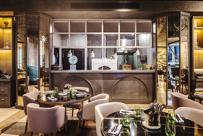 В баре сохранили отделку ониксом, но при этом несколько изменили геометрию: сместили стойку в зал, добавили металл и зеркала, которые расширяют пространство и контрастируют со сдержанной цветовой гаммой лобби, обращают внимание гостей на бар. Ведь доходы от бара — важная часть рентабельности отеля, поэтому его необходимо выделить в современном интерьере отеля, зазвать туда гостей и случайных прохожих».