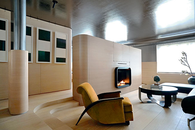 Само здание — памятник нью-йоркского ар-деко, архитектор трансформировал старую однокомнатную квартиру в пространство с открытым планом: все элементы ар-деко были переосмыслены в современном духе.