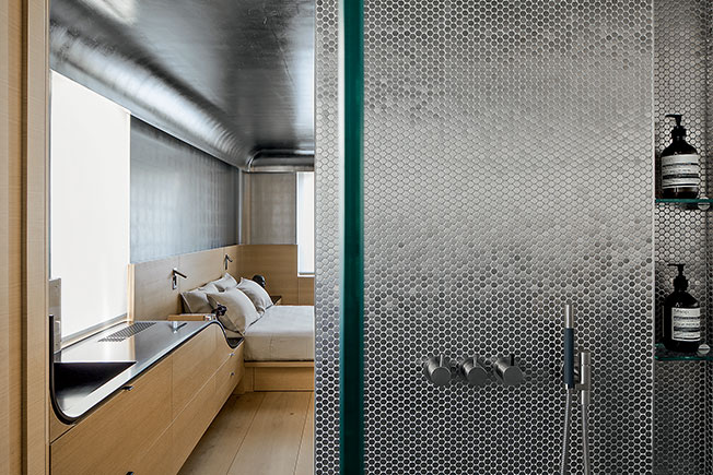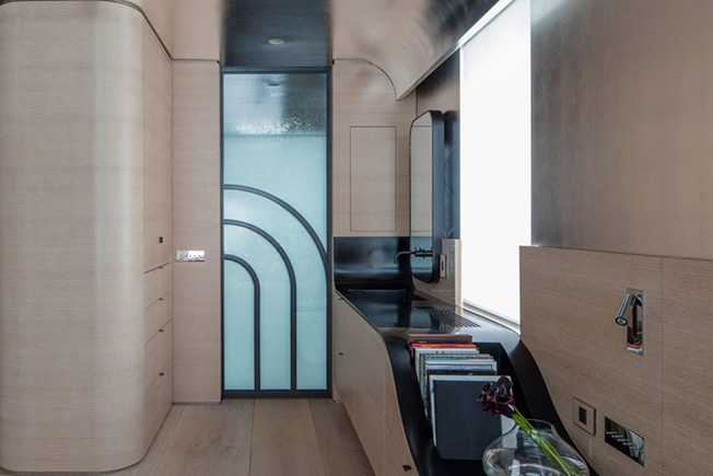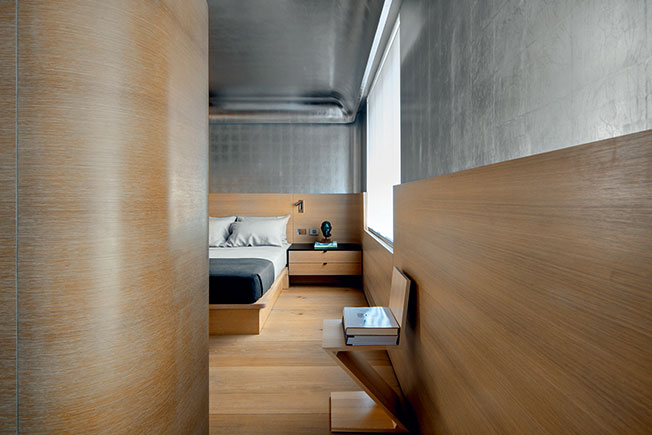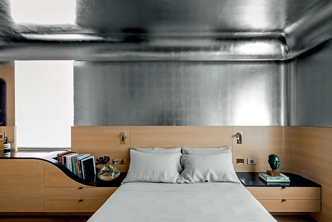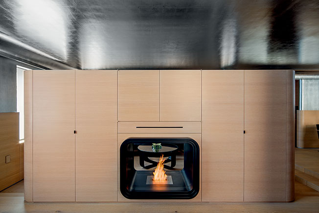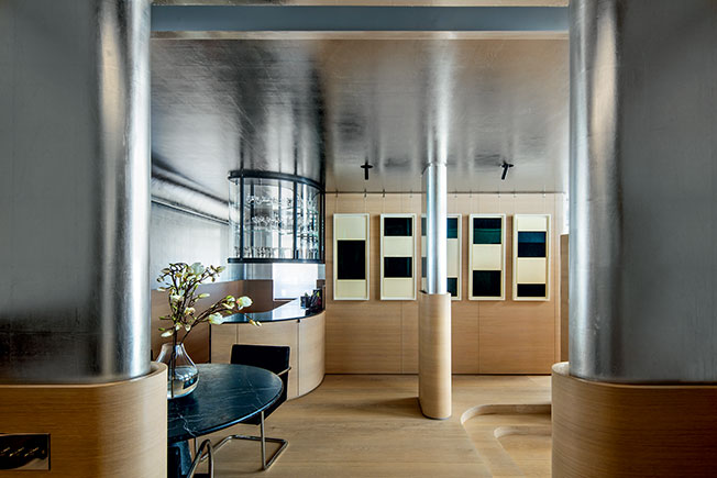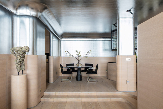 Листовое серебро ручной работы и панели из отборного европейского дуба — невероятно смелый выбор. За счет деликатной подсветки серебро мерцает, выглядит таинственным и сюрреалистичным. В интерьере почти нет прямых углов, что подчеркивает текучесть пространства.