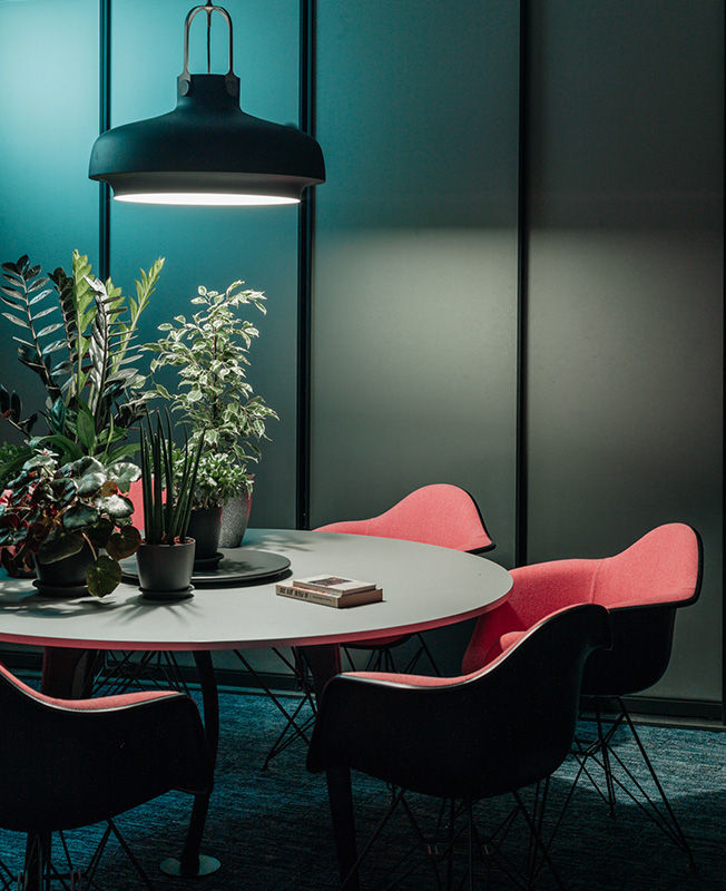 Мы выбрали светильники Zumtobel со светом вниз и вверх — и вечером он мягко рассеивает дополнительный свет. Жаль, конечно, эту красоту не передает ни одно фото — переливы серебристой краски раскрываются в движении. К свету относится и самая сложная технологически часть — офис демонстрирует новинки в области электрики и управления светом. Каждое помещение имеет минимум три варианта сценария освещения, а управлять ими можно прямо с iPhone. Почти все приборы диммируются.