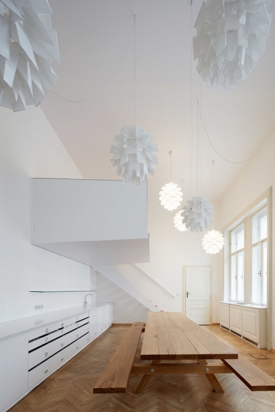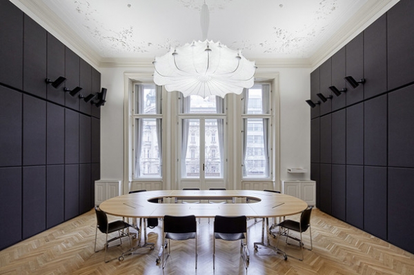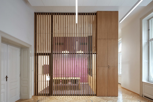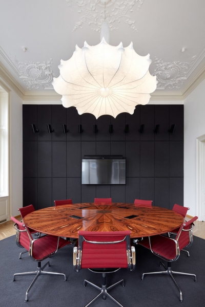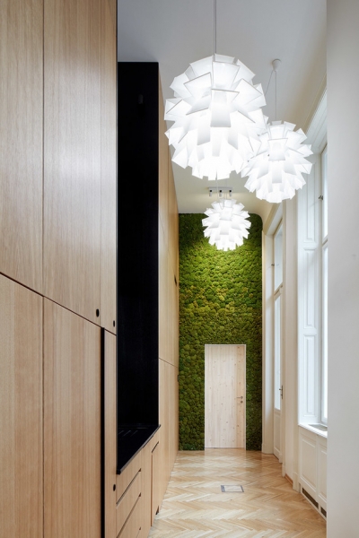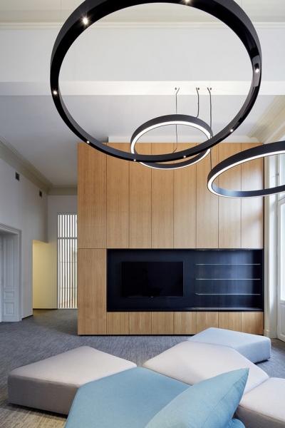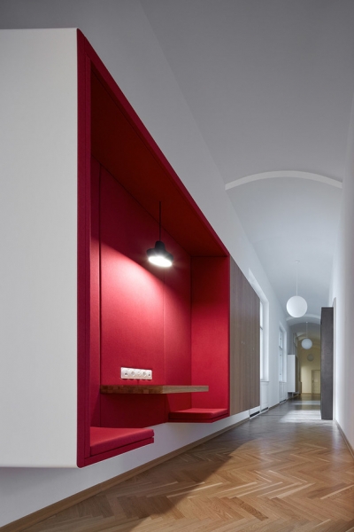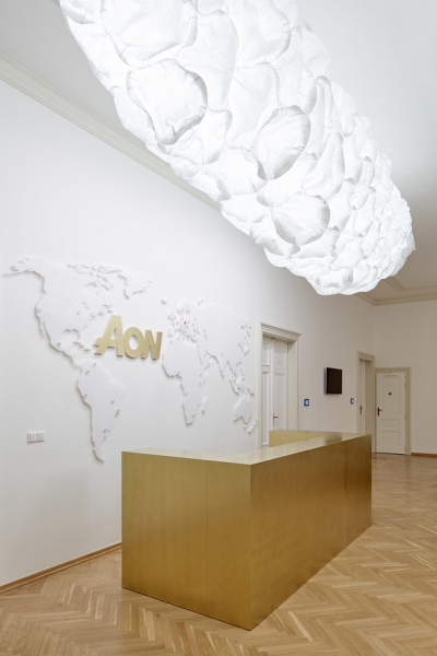 Архитекторы чешской студии сразу поняли поставленную им задачу и преобразовали здание знаменитого австрийского архитектора Фридриха Омана 1896 года постройки в стильный и презентабельный офис. Уже при входе сотрудников компании и их клиентов встречает длинная стойка регистрации с логотипом компании, выполненные из латуни, и большим светильником в форме облака.
