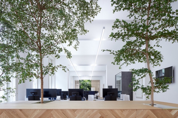Из холла можно попасть в просторный конференц-зал, который при желании легко превращается в три маленькие переговорки благодаря мобильным акустическим панелям.Четыре опен-спейса, где работают сотрудники компании, располагаются по периметру здания. Благодаря большим окнам и белоснежным стенам в офисе всегда светло, а в одной из рабочих зон даже растут небольшие деревья, посаженные в специальные деревянные панели.