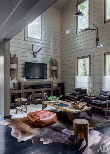 Гостиная. Бра около телевизора сделаны из остатков бельгийского старинного паркета и льняных абажуров; бра между окнами на стене справа, Serge Mouille; кожаные кресла, Marie’s Corner; столики, деревянные аксессуары и кожаный пуф сестры привезли из Межева.
