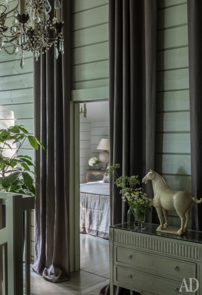 Холл второго этажа с видом на спальню мамы Илоны и Ирины. Льняные шторы, de Le Cuona; антикварная люстра из Франции.