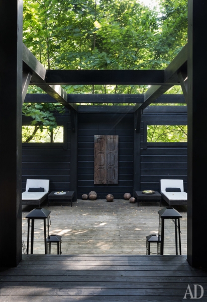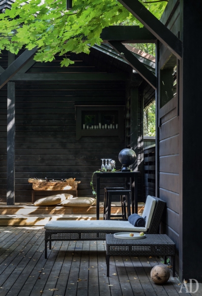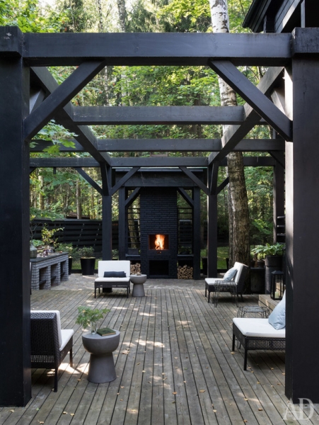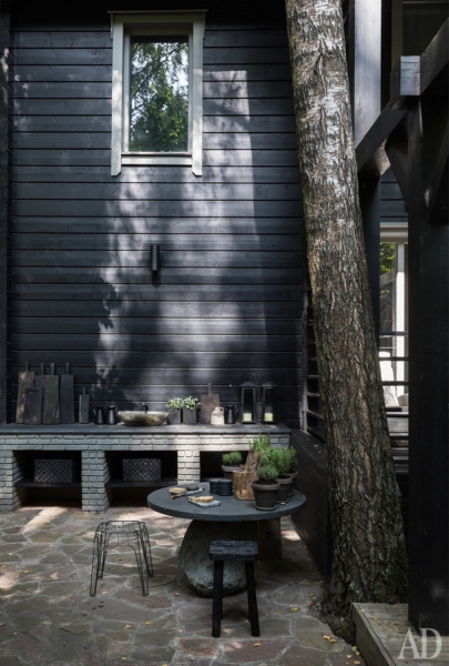 Лишнего цвета в этом доме нет. По замыслу дизайнеров, ничего не должно отвлекать от медитативной лесной атмосферы. Черный цвет в своих проектах они используют нередко, но нужна смелость, чтобы решиться на него в своем доме. Илона вспоминает: “Дом сам подсказывал, что нужно что-то делать с цветом. Он стоит в сосновом бору, летят иголки, грязные листья, мох, влажность. Дерево ванильного оттенка все это впитывало, и дом стал грязно-серым, природа стала его облеплять”.